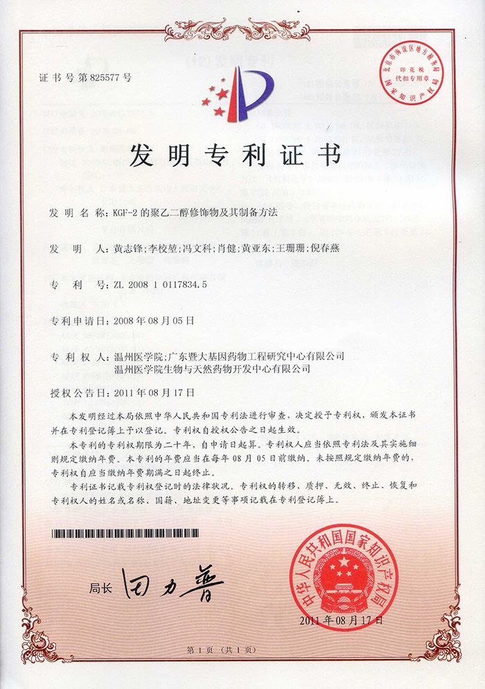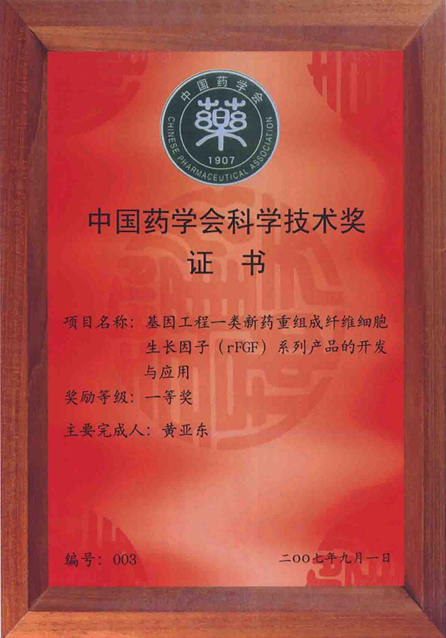 中國(guó)藥學(xué)會(huì)科學(xué)技術(shù)一等獎(jiǎng)-基因工程一類新藥重組成纖維細(xì)胞生長(zhǎng)因子(rFGF)系列產(chǎn)品的開發(fā)與應(yīng)用
