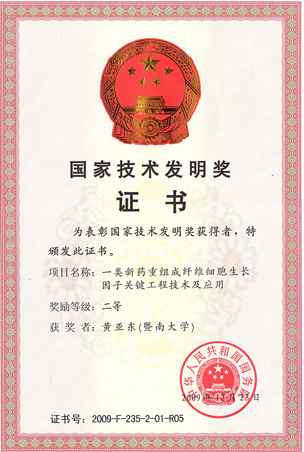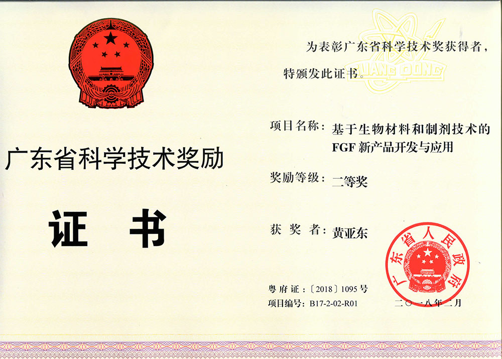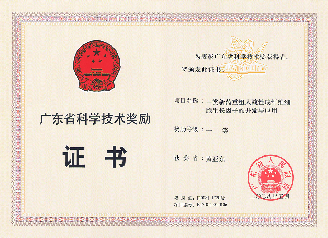 廣東省科學(xué)技術(shù)獎勵一等獎-一類新藥重組人酸性成纖維細胞生長因子的開發(fā)與應(yīng)用