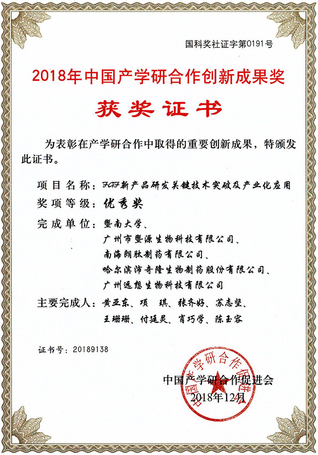 產(chǎn)學(xué)研合作創(chuàng)新技術(shù)成果獎優(yōu)秀獎-FGF新產(chǎn)品研發(fā)關(guān)鍵技術(shù)突破及產(chǎn)業(yè)化應(yīng)用