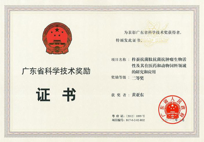廣東省科學(xué)技術(shù)獎勵二等獎-柞蠶抗菌肽抗菌抗腫瘤生物活性及其在醫(yī)藥和動物飼料領(lǐng)域的研究和應(yīng)用