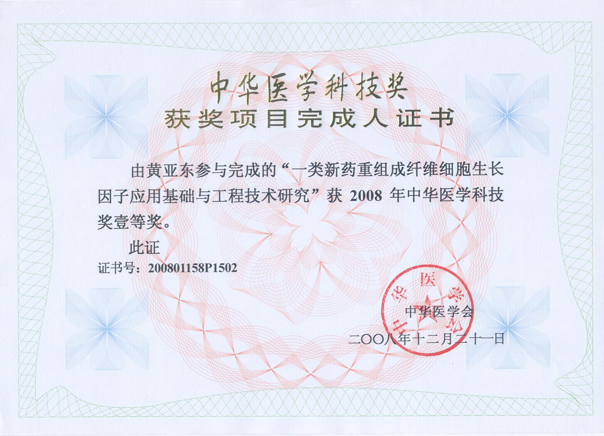 中華醫(yī)學(xué)科技獎一等獎-一類新藥重組成纖維細胞生長因子應(yīng)用基礎(chǔ)與工程技術(shù)研究